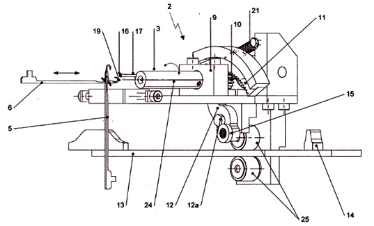 Figure 4 Functional elements of LTL prototype of patent application [8]: cylinder needle (5), rib needle (6), support rail (13), raising cam (14), track rollers (25), contact wheel (15), guide needle (17), rotating finger (24), and mechanical linkage (10).