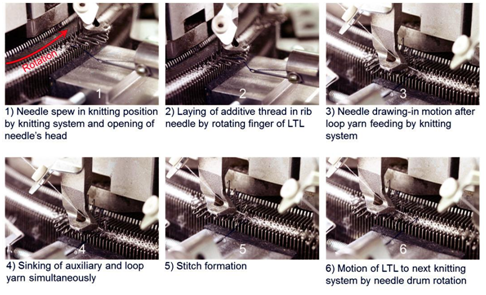Figure 10 Additive loop thread laying sequence using LTLS: rib needle clearance into pick-up position & additive loop thread laying (1), elastane-copper-hybrid twisted weft yarn insertion (2), pick-up position of rib needle and standard loop thread insertion (3), rib needle clearance into pick -up position & additive loop thread laying (4-5), standard loop thread insertion and stitch formation (6).
