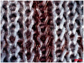 Figure 6 enmeshed 50 µm copper wires (material-no.2.0065, J.G. Dahmen GmbH & CO. KG) integrated in stitch wale direction of a circular knitted fabric produced on a 14 in. Double-Jersey machine with E20 machine gauge by usage of the LTL prototype.