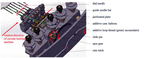 Figure 7 Schematic of the additive loop thread laying system (LTLS) for the integration of additive loop yarn sheets in stitch wale direction of designed as accessory equipment for large circular knitting machines.