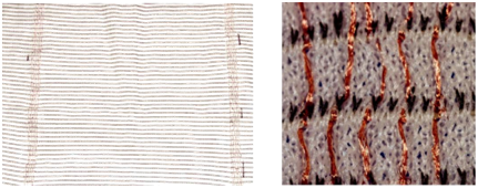 The weft thread is most securely contacted by the additional thread sheets if their insertion into the gripping rib needles is followed by the feeding of the weft thread under the rib needles and behind the cylinder needles at the subsequent cam assembly system, which is configured in the knitting position Figures 10(1)-(3). The additional threads located in the head of the rib needle are not formed into loops. Afterwards, the additional thread is inserted again with the LTLS (without stitch formation, i.e. half meshes and additional threads remain on the opened needle latch), using two additional modified dial cams in pick-up position. The incorporation of the additional thread sheet and the interlacing/contacting of the weft threads is completed by the loop formation (first simultaneous stitch formation of the additional threads with mesh thread) on the cam assembly system located after the modified dial cams. Figure 11 shows a section of a PES circular-knitted fabric structure with two additional thread ribbons consisting of five stranded copper wires each, which contacts the elastane-copper twisted yarns running in every sixth stitch course. The fabric structure was manufactured using the integration sequence described above. As two such routing ribbons are incorporated at the fabric circumference, a parallel resistance is created and can be utilized as a resistive heating element.