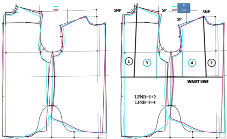 Pattern block: In total, two pattern blocks were obtained from this study. The first two „H” dress patterns resulted to the subsequent two patterns. With the exception of the side seam position and sloping shoulder line, all pattern block indexes were constant. In particular, the neckline and armhole were maintained the same. As shown in Figure 1, the angle of the shoulder lines for the first and second blocks was reduced by rising the shoulder point and dropping the shoulder neck point by 0.5 to 1 cm. All pattern block adjustments must affect how dresses fit and balance, and they also allow us the ability to alter how actual shirts fit and balance.
