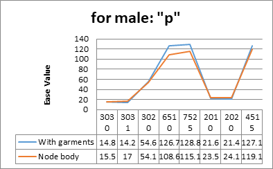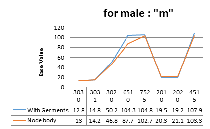 We can see, most of the parameter has 2 to 4 cm ease between node body and the garments. Male number one and two wearing the “H” Style garments for each. In “H” Style garments is not like the “X” style garments. This research also suggest about the amount of ease should be fitted for which type of body. For body item number 6510 and 7525 which indicated about the exceptional body parameter (18.1 and 13.7) have to control the ease distribution. According to his body shape in the parameter 6510 eases should be ±10 (Should be decreased) and in the parameter 7525 eases should be ±5 (Should be decreased).4–7