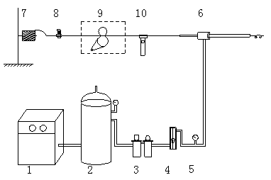 Figure 1 Schematic diagrams of the experiment apparatus: (1) compressor, (2) rectification tank, (3) valve, (4) flow meter, (5) pressure adjuster, (6) yarn suction gun, (7) bobbin, (8) tension adjuster, (9) feed roller and (10) tension meter.