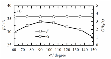 Figure 3 Effects of the converging angle (α) of the Laval tube on the performance of the yarn suction at β=4˚: (a) yarn suction force (F) and mass flow rate of compressed air (G), (b) yarn suction efficiency (η).