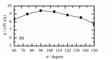Figure 3A reveals that there was no significant effect of the change of α value on the flow rate of compressed air (G). The yarn suction efficiency (η) showed the same change trend with the F with the variation of α. The η also reached up to the maximum value at α=90˚, as shown in Figure 3B. We concluded that the rational value of α was about 90˚ based on the values of η and F.