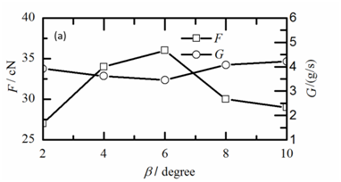 Figure 4 Effects of the diverging angle (β) of the Laval tube on the performance of the yarn suction at α=90˚: (a) yarn suction force (F) and mass flow rate of compressed air (G), (b) yarn suction efficiency (η).