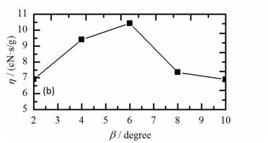 The normal shock wave with the larger intensity moved upstream in the diverging section of Laval tube when the value of the β was too large, which caused that the acceleration of air stopped early and the air flow extremely expanded. There was no contribution to the increase of F because of the conversion of the kinetic energy to thermal energy. The flow through a shock wave is not isentropic, since part of the kinetic energy is converted into heat.21 The flow rate of the compressed air exhibited the opposite distribution compared with that of the F. Moreover, the change value of the G was too small, which can be neglected. Figure 4B indicates that the change curve of the η was similar to that of the F due to the negligible change of G. A large yarn suction force could be obtained by using the Laval tube with the appropriate diverging angle of β=6˚. Therefore, the results of the experiments suggested that the optimum value of β was 6˚ based on the consideration of the η and F values.