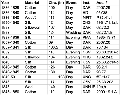 Figure 3 The eighteen-item sample, dating to the period 1836–1845, from museums and institutions on the east coast of the USA (see references for institutional acronyms). Columns are year (often a ‘circa’ date); primary construction material; hem circumference in inches; category of dress; holding institution; and accession or inventory number.