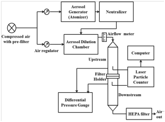 The principle of air filtration efficiency tester as per ASTM F2299-03 was shown in Figure 3. The dry and clean air was obtained from compressor and fed to the air regulator. NaCl was used to generate aerosol and the size of the aerosol ranging from 0.3 to 10 micron. The aerosol was passed through the neutraliser (P-120) and diluted before passing through the filtration chamber. Sample of 80mm diameter of multilayer nonwoven fabric was fixed between the holders. The velocity of the air flow with aerosol was maintained as 5cm/s and the pressure difference between the up and down stream was continuously monitored. Further increase in face velocity will decrease the filtration efficiency of the nonwoven fabrics. Particle size was measured by laser particle counter (Lasair III, Particle measuring system) from up and down air stream to calculate the filtration efficiency. The air filtration efficiency is calculated by equation 2.