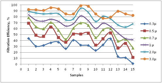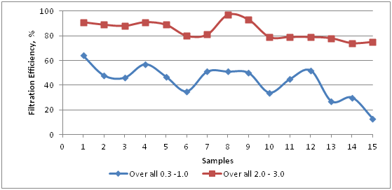 The filtration efficiency of the as prepared samples has been tested in filtration efficiency tester for the particle size of 0.3, 0.5, 0.7, 1, 2 and 3 microns. The filtration efficiency of the MLNF has been tested for two groups of particle sizes such as 0.3 to 1 and 2 to 3 and the results are also given in table 2. The proportion of P/C/V as 30/40/30 and 40/30/30 gives higher filtration efficiency as 91% and 93% respectively with the air permeability of 91.3 and 94.7cm3/cm2/s.