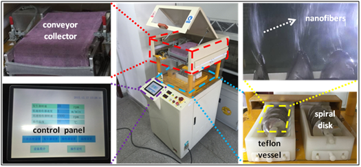 Currently, PM2.5 as a sensitive indicator has drawn public attention. Studies on new materials to filter dust, pollen and toxic materials and to effectively inhibit the growth of bacteria are needed. Electrospun nano fiber membranes, characterized by their great flexibility,1,2 light weight, high surface-to-volume ratios and porous structures, have been shown to have wide applications in many fields, especially in filtration.3−6 However, conventional single-needle electro spinning does not satisfy industrial production due to its low productivity, and electric field interference exists for multi-needless electro spinning.7 Needleless electro spinning could solve the above problems and make industrialization possible. The main techniques for needleless electro spinning currently are tip electro spinning of the liquid surface,8−14 conical wire coil spinnerets,15 multi-hole/porous spinnerets16−18 and rotary cylinder/cone/disk spinnerets.19,20 Designed a perforated pipe needleless electrostatic spinning apparatus.21 The spinning jet density was relatively high, approximately 250 times that of traditional single needle electro spinning production, but the uniformity of the fibers was poor. Designed a bubble electro spinning device inspired by the spider spinning process.22 The diameter was approximately 50nm at a lower voltage, but the diameter was volatile due to its susceptibility to the effect of bubble size. Designed a rotating spiral wire electrostatic spinning apparatus which greatly improved production.23 With the increase in voltage and the decrease in distance, the output of the nano fibers also increased, but little change in the diameter was observed.
