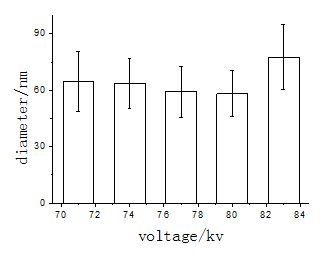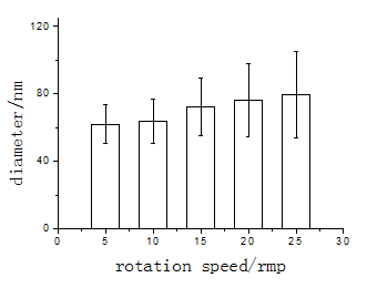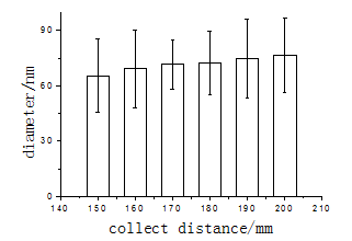Figure 4 shows the changes of the nano fiber diameter under different collection distances at a rotation speed of 15 rpm and voltage of 74kV. The average fiber diameter was minimum when the collection distance was 150 mm, and the fiber diameter reached a maximum when the distance was 200mm. The decrease in the collection distance led to an increase in the electrostatic field force on the jets, which caused sufficient stretching. Figure 5 shows the changes of the nano fiber diameter under different rotation speeds at a constant distance of 180mm and a voltage of 74kV. With the increase of spiral disk rotation speed, the fiber diameter increased from 62nm to 80 nm, since more solution was ejected from the spiral disk.