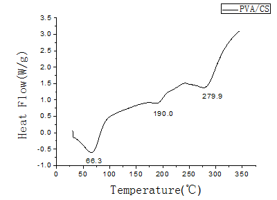 Heat treatment of PVA/CS nano fiber membranes: To improve the water resistance of the prepared PVA/CS nano fiber membranes, heat treatment was used due to it can help increasing the degree of crystallinity of PVA/CS29 What’s more, it is a simple and environmental friendly way. By heat treatment, the will rise, to increase Differential scanning calorimetry analysis was used to investigate the melting points of PVA and CS. From Figure 7, the melting points of PVA and CS were found to be 190˚C and 279.9˚C. Excessive heating above 190˚C resulted in the destruction of the PVA quality. However, cross-linking could not be achieved27 if the temperature is too low. Thus, the heat temperature was set at 180˚C. Figure 8 shows the immersion of PVA/CS nano fiber membranes for 1h after heating treatment for different times. After heat treating the nano fiber membranes for 3h and 4h, the membranes were immersed in water (25˚C). The fibers swelled to a large degree shown in Figure 8a & b, and most of the interspace of nano fibers was blocked which hindered the air permeability and changed the morphology of the nano fibers immensely. However, heat treatment for 5h did not alter the morphology of the fibers basically Figure 8(c). Considering the degree of fiber swelling and the fiber morphology, 180˚C heat treatment for 5 h was the most preferable condition. It is worth noting that upon physical cross-linking by heating, a change in the color of the nano fibers from white to yellow was observed.