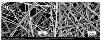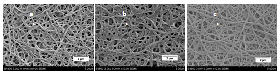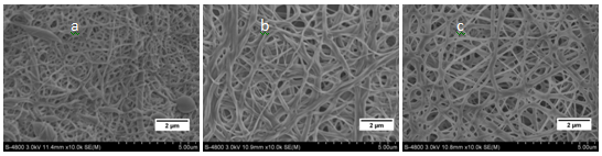 The morphologies of nano fiber membranes were examined through field emission scanning electron microscope (FE-SEM, Hitachi S-4800, and Japan) images. The diameters of nano fibers were determined using an image analyzer (Image-Pro Plus 5.0) by averaging 100 measurements in SEM images.