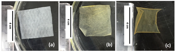 GA solution treatment: GA could have acetal and hemiacetal reaction with PVA and CS to get higher water stability. PVA/CS nano fiber membranes were immersed into 5% GA solution (acetone as the solvent) for 0.5h, followed by repeated washing using deionized water. Then, the membranes were placed into a vacuum drying oven at 40˚C for 24h to remove the GA residues. Figure 10 shows the GA solution treatment of PVA/CS nano fiber membranes. It can be seen that the membranes exhibited good anti-water-soluble properties. After immersion in water for 1 h, no difference was observed in the fiber morphology, and the color of the membrane remained unchanged Figure 11(a). Figure 11 shows images of immersed PVA/CS nano fiber membranes in deionized water after different anti-water-soluble treatments. The original sizes were 4 cm×4cm. It can be clearly seen that the heat-treated membrane shrank considerably Figure 11 (c). The dimensional change rate was 25%, which was the largest Table 4. Furthermore, the color of the membranes Figure 11b & c turned yellow obviously. However, the membrane treated by GA solution Figure 11(a) retained its original shape and color; meanwhile, there was minimal, if any, weight loss. These results agreed with the fact that there was a great increase in the degree of water resistance when treated by GA solution.