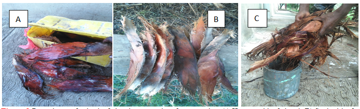 Figure 1 Procedures of palm leaf sheath preparation for extraction A) Harvested leaf sheath B) Soaked leaf sheath C) decorticated fiber.