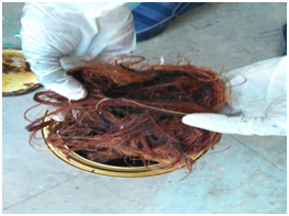 Figure 2 raw palm leaf sheath Fiber extracted by chemical degumming. The raw fiber has reddish yelow color and its sticky.