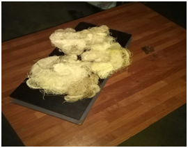 As it can be understood by comparing Figure 2 and Figure 3; the fiber in Figure 2 is white and fiber stickiness is less compared to fiber in Figure 2. The peroxide bleaching revealed the white color of the palm leaf sheath fiber and rid off the sticky substances from the fibers.