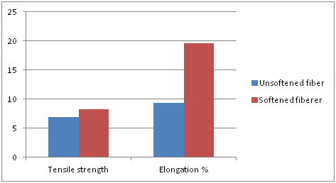 Testing, tensile strength, elongation and longitudinal: Both softened and un softened fibers characterized under the same condition. The tensile test carried out on a batch of 50 fibers relating to the determination of the strength and elongation at break under tensile stress. 25mm distance between clamps taken. At constant speed equal to 20mm/min and a force of 50N. The test was conducted at (ambient temperature of 28˚C and R.H. of 65%).
