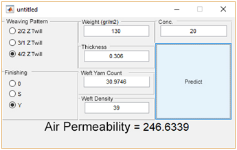 In this study air permeability features of the fabrics which were weaved at different characteristics were tried to be guessed at pre-production stage. At this study it was aimed to establish artificial neural network models which were able to predict the comfort characteristics sourced from the parameters’ data at pre-production stage. And it was also designed an interface to facilitate forecasting applications by the help of MATLAB GUİ programme.