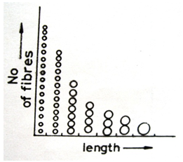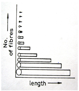 In jute, the raw fibre as it comes from the plant consists of many single filaments bonded together by adhesion and branching to form a three-dimensional meshy structure. On carding, this meshy structure is broken into individual fibrous elements of different lengths , the longer elements being more complex, since these consists of several single filament still joined together in some way. This complexity will cause the linear density of the longer elements to be greater than that of the single filaments. In addition, the single filaments in the longer elements may be thicker and stronger than those in the shorter ones. On both these counts, the linear density of the longer elements will be greater than that of the shorter ones Banerjee.1 When the meshy structure of raw jute reeds is broken down randomly into fibrous elements in a carding machine, the frequency of such elements by number can be expected to decrease exponentially with increase in their length Banerjee.2 In this paper a graphical presentation of jute fibre length distribution is made.