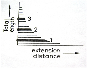 Figure 1 is the graphical representation of data collected by measuring length of single fibres. The vertical axis is number (quantity) of fibre, the horizontal axis fibre length increments, and each circle o, represents a single fibre. One could imagine that the o‘s are end views fibres stacked vertically with each stack consisting only of fibres of same length. To the left hand side are the short fibres, the right hand side the long fibres. Statisticians call Figure 1 a histogram or length frequency distribution diagram. Figure 1 gives all of the information we need to know about fibre length and fibre length distribution. Since it is easier to determine the weight of fibre than to count the number of fibre, histograms and staple diagrams (arrays) are usually constructed on fibre weight basis. For clarity and ease of explanation, fibre number basis is used in this discussion. Detailed discussion about number and weight basis of testing is made in later section of this paper. Another method of representing data collected by measuring length of fibres is in Figure 2a. The vertical axis is number (quantity) of fibre, the horizontal axis is the fibre length and each cylinder represents a fibre. Figure 2a is a picture of fibres arranged in order of length with left hand ends aligned at the vertical axis. Figure 2a is simply a rearrangement of Figure 1 & 2a is the staple diagram and, as in Figure 1, contains all of the information we need to know about end to end lengths.