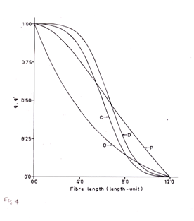 Figure 4 Theoretical Survivor diagrams of cotton fibre of 6 length-unit mean fibre length and12 length-unit maximum fibre length on the basis of number from an end- biased sample (curve-C) and length-biased sample (curve-D); and jute fibre in sliver and yarns of 6 length-unit mean fibre length and 12 length-unit maximum fibre length on the basis of number from an end-biased sample (curve-O) and length-biased sample (curve-P).