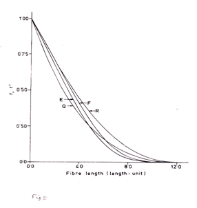 Figure 5 Theoretical Fibrograms of cotton fibre of 6 length-unit mean fibre length and12 length-unit maximum fibre length on the basis of number from an end- biased sample(curve- E) and length-biased sample (curve-F); and jute fibre in sliver and yarns of 6 length-unit mean fibre length and 12 length-unit maximum fibre length on the basis of number from an end-biased sample(curve- Q) and length-biased sample (curve- R).