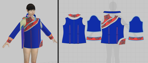 According to the formula calculation, the original modeling points of the clothing can be obtained, and then the uniform grid points of the clothing pieces can be interpolated to obtain the clothing modeling points. The three-dimensional virtual simulation design of Mazu clothing is processed in the three-dimensional clothing design software CLO 3D according to the following steps. First, the 3D mannequin that comes with the system is retrieved, and the size of the mannequin is edited through the "Virtual Model Editor", and the size is edited according to the 160/84A standard female human body size to generate a 3D virtual mannequin that conforms to the size of Mazu's clothes. Secondly, the pattern file of the big shirt is imported through "Import DXF (AAMA/ASTM)", the pattern position is adjusted in the 2D window, the pattern is filled, the internal lines are outlined, etc., in the 3D window according to the pattern and the human body. The three-dimensional positions of the corresponding patterns are arranged, and the hierarchical relationship of each pattern is noted. Third, the sewing thread tools (thread sewing and free sewing) are comprehensively applied, and the corresponding sewing lines of each pattern are set according to the sewing relationship between the various pieces of the big shirt. Simultaneously viewing the sewing line in the 3D viewport, it needs to be careful not to have wrong seams, cross seams, leakage seams, etc., as is shown in Figure 2.