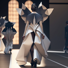Through the obtained discrete points, the points on the upper and lower curves in sequence are connected to construct a triangular mesh. The interval value of discrete points should not be too large, otherwise it will cause under-fitting, and it should not be too small. If it is too small, it may not only cause over-fitting, but also increase the unnecessary computational burden. The only difference between the construction methods of different parts is the way of generating the boundary curve, and its essence lies in the relative positions of the feature points. It is roughly divided into two cases, when the two feature points are located directly above the human body, such as the two features points SP and SNP required when constructing the shoulder curve. When the control points are located around the body, such as the configuration of the lateral chest curve, there are differences in the configuration of the shoulder curve, but the configuration principle of the curve is the same anyway. Figure 3 shows a virtual model wearing a Mazu Clothing design walking down a runway. Figure 4 illustrates Mazu Clothing design in different lighting conditions, such as natural light, artificial light, and low light. This can help demonstrate how the color and texture of the fabric change in different contexts. Figure 5 shows Virtual model wearing the Mazu Clothing design in a store or showroom setting, with different angles and lighting conditions.