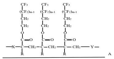 The first water repellent chemical is dispersion of fluorine compounds, namely fluorocarbon (FC). FC was applied on fibre, after curing process should form a structure that presents a dense CF3 outer surface to provide maximum repellency. A typical structure is shown in Figure 1. The length of the perfluorinated side chains is about 8–10 carbons. Co-monomers are X,Y, for example are stearyl- or lauryl-meth-acrylate, butyl-acrylate, methylol- or epoxy-functional acrylates.