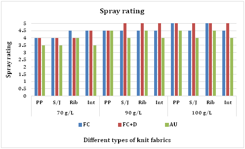 Color fastness to sea water: It is done by ISO 105-E02 method. The rated chart is given below in Table 10. The sea water fastness of FC+D water repellent chemicals shows better result than FC and AU chemicals for polo pique, S/J and rib fabrics. The improvement of sea water fastness of water repellent finish is because of the dye molecules trapped inside the crosslinking film.