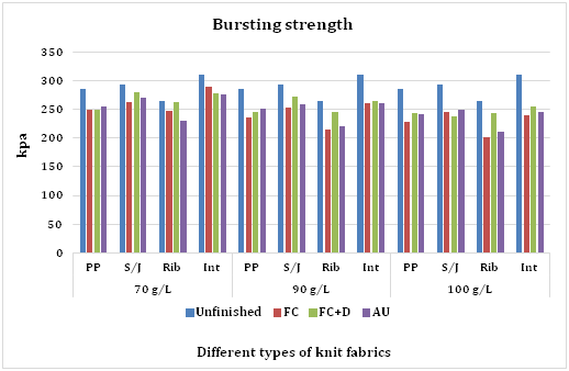 Table 7 Bursting strength of different fabrics treated with water repellent chemicals at 70g/L, 90g/L and 100g/L conc