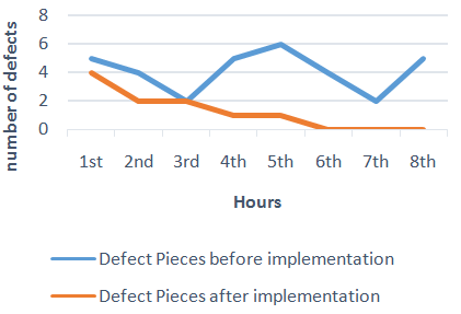 The Figure 1 illustrates the comparison between before implementation and after implementation of the traffic light system. From the graph, it has been observed that after the implementation of the traffic light system, the number of defects reduces, also at 6 to 8th hours no defects determined. Comparing Table 1 and Table 2, it was declared that the average defect rates decreased indicating a successful sewing line than before.