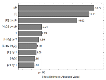 From the experimental design results, it was possible to obtain the Pareto chart (Figure 1), that shows the effects of the experimental variables on the remazol black dye decolorization under the studied conditions. Figure 1 shows the Pareto chart with the independent studied variables in terms of remazol black dye decolorization by horseradish peroxidase enzyme. It is clear from the figure that the variables with the significant effect (p<0.05) were pH, with a negative effect, and enzyme concentration, with a positive effect. The best conditions of decolorization were at pH 4 (level -1) and enzyme concentration at level +1 (39.97 U/mL). On the other hand, the temperature not showed significant effect (p<0.05) on the decolorization remazol black dye.