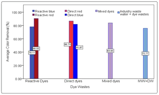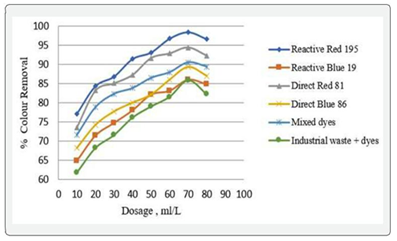 Comparative colour removal efficiency between reactive, direct dyes and mixture of them with industrial wastewater for both the dyes is shown as bar chart in Figure 12. The average colour removal efficiency of reactive dyes is higher than direct dyes, because reactive dyes are water dissolved due to the negative charge of the sulphonate group (SO3-) and direct dyes are the molecular structure with planar positive charges that are more than the negative charges and is water soluble. Direct dyes also have sulphonate (SO3-) functionality, but in this case, it is only to improve solubility, as the negative charges on dye and fibre will repel each other. The colour shade affects the efficiency of reactive colour removal of natural coagulant. In case of mixed dye, the averages of colour removal are found between reactive and direct dyes, because all reactive and direct dyes are mixed together and to have interchanging of all charges which affect colour removal.