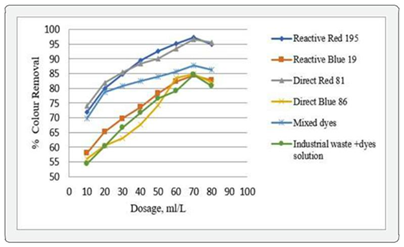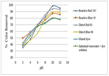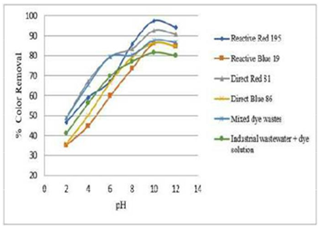 From these figures, we can understand that the highest colour removal was at pH 10 for all dye wastes. As pH increases from 2-10 the colour removal from textile wastewater increases. The removal of dyes are more at higher pH 10, because the surface of activated coagulants are negatively charged, decrease in adsorption capacity at the low pH values would be expected as the acidic medium would lead to an increase in hydrogen ion concentration which would then neutralize the negatively charged coagulant surface thereby decreasing the adsorption of the positively charged ions because of reduction in the force of attraction between adsorbate and adsorbent.22–24