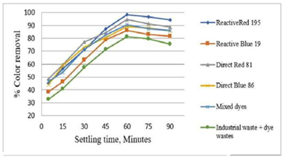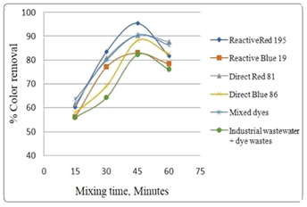 The time of macro-floc formation (flocculation time) is one of the operating parameters that is given great consideration in any water treatment plant that involves coagulation–flocculation operations (Figure 4) (Figure 5). Presents the effect of flocculation time using different dose of coagulants for removal of reactive dyes, direct dyes, mixture of industrial wastewater, dyes of textile effluents. Consistence increment of removals has been revealed with increasing flocculation time up to 60min, and then it decreased. The optimum flocculation time was found to be 60min. The maximum removal of selected dye colours was found to be 98.4, 86, 94.45, 89.3, 90.5 and 81.5% in reactive red, reactive blue, direct red, direct blue mixed dyes and mixture of dyes/and industrial wastewater respectively in simple extract at 60 minute. As well as, for saline extract the maximum colour removal was 97.3, 84.41, 96.6, 84.8 87.73 and 80.3% in reactive red, reactive blue, direct red, direct blue, mixed dyes and mixture of dyes/and industrial wastewater respectively.