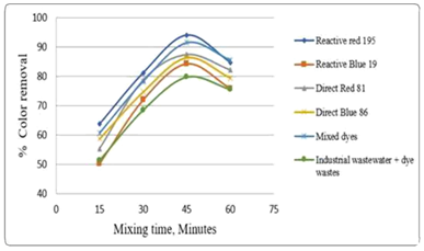 Studies were made to find out the effect of mixing time variation on colour removal efficiency. Various mixing time ranging from 15 minutes to 60 minutes were maintained and the results were reported in Figure 6&7. The experimental result shows that there was a continuous removal of colour, turbidity, TDS and TSS while increasing the mixing time from 15 to 45 minutes. Similar results are observed by Patel and Vashi for some other dyes.19 When the mixing time is less than 45 minutes, the collisions between coagulants and colloids are not efficient to precipitate suspended solids in wastewater. On the other way, if the mixing time is greater than 45 minutes, it would lead to an increase in flocs breakage & limit the size of the floc formed. As a result, small size flocs are not dense to settle down & cause the sample to be turbid again. In sum, it is also found that the longer or shorter mixing time would result poor performance of the coagulant seed for binding and bridging. There were similar results in experiments made by other researchers. Initially at less contact time (≤15min.) the maximum colour removal efficiency was achieved to only 63.6% and 63.7% for mixed dyes and reactive red respectively in both simple and saline extract methods respectively. But results show that when the reaction time was increased to 45 minutes, the efficiency was nearly 95% and it decreased when time increased was beyond 45minutes.20,21