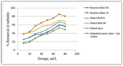Varying doses of the seed extract were added to the effluent followed by mixing at optimum time. The mixture was then filtered through filter paper, finally measure the turbidity value by turbidity meter. The result shows that the higher turbidity removal efficiency was obtained in simple extract method in the order of 84.6% and 83.7% in Saline extract methods for reactive blue dye (Reactive Blue 19) with the dosage of 70ml/L as shown in Figure10&11.