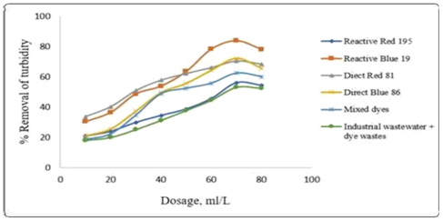 After the characterization of the effluent, the prepared coagulants from the Moringa stenopetala seeds were added to the effluent in the form of coagulant to determine the effectiveness of the extract over the textile effluent. The result shows that the extract removes the turbidity and colour from the textile effluent. Removal efficiency of up to 98.4%, for colour, was reached using 70ml Moringa Stenopetala coagulant extract. The use of Moringa seeds has an added advantage over the chemical treatment of water because it is biological and has been reported as edible. All dyes selected for this study, was prepared in the laboratory for treatments and also mixed with industrial wastewater. A dye solution was prepared as required and its pH was measured by using pH meter. One liter of the initial solution was transferred into two beakers and various doses of coagulant were added (10, 20, 30, 40, 50, 60, 70 and 80 in ml/L). The beakers were put one by one onto a standard magnetic stirrer. The solution was stirred for 10 min at high speed and slowly mixed at 60rpm for 30-35min. Later, the solution was left for settling around 45-60min. The supernatant after settling filtered through a Whatman filter paper (pore size 20–25µm). Reduction in colour concentration was measured at maximum absorbency visible wavelength of each dye solution by using a UV-VIS spectrophotometer. The result of colour removal is shown in Figure 2&3. In industrial wastewater colour removal is less because the effluent contains high content of dyestuff, surfactants and other additives that are generally made up of organic compounds with a complex structure. These wastewaters are collected from different sections having such different compounds and collected in wastewater plant for treatment.