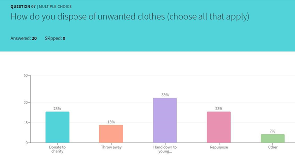The participants have been asked about the way they dispose of their unwanted garments. This question is meant to offer a clear image of their behavior. Over 50% of them hand their clothing to others in need, by donating them to charity or younger family members, friends, acquaintances (Figure 1). This gives a clue regarding the way the consumer cares for its garments, assuming that their donated items are still in good condition. This way of disposing seems more comfortable and efficient, but only when it comes to a certain category of garment. Ideally, the clothes that are worn out, torn or have any sort of damage should be disposed at local collecting bins that specialize in sorting and recycling. However, unfortunately that’s not the case, since 5% of the consumers questioned have claimed that they simply throw away their unwanted clothing. This highlights the poor level of information, education of the consumers, as well as the poor fabric waste management.