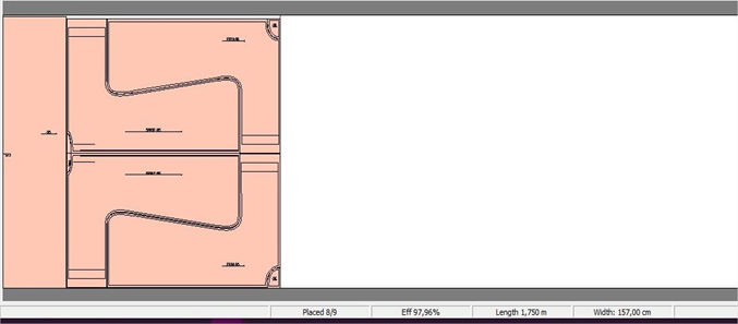 In the same time, the fabric consumption has decreased by 64.8%, meaning that it takes less fabric to cut the zero waste patterns, hence their jigsaw placement. It’s important to mention that both pattern sets have been nested on the same fabric width, Figure 5 and Figure 6.