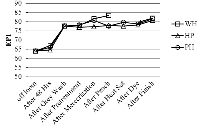 The fabrics without heat-set, heat-set then pretreated and pretreated then heat-set were tested for EPI, PPI, GSM, width, shrinkage, growth and recovery. The results are shown in Figures 1–4. The Figure 1 shows that there is no significant difference in EPI among the three samples due to the three different processing approaches. Though, the grey washing results in an increase in EPI in general because of the relaxation of the temporary stresses in the yarns imposed during weaving.15 There is an overall increase in EPI of fabrics due to different finishes applied on the fabric.