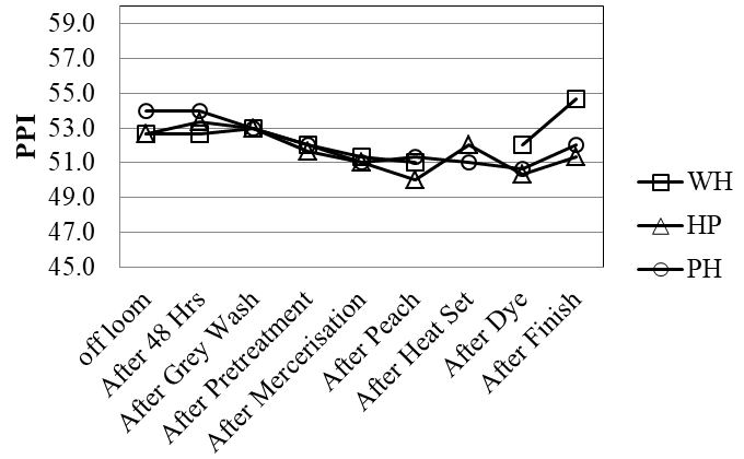 The Figure 2 shows a falling trend in PPI for the fabrics that has undergone heat setting treatment and an increase in PPI was observed for fabric processed without heat set. Among the three methods the heat set then pretreat shows comparatively more decrease in PPI.