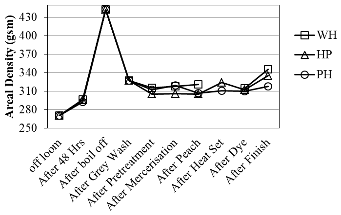 The Figure 3 shows effect of different processes on fabric areal density GSM and a significant difference can be observed due to different processing route. The without heat set sample shows comparatively higher values for areal density followed by heat set then pretreated and then pretreated then heat set sample. The literature advocates the generation of higher retraction force by weft yarns containing spandex. This results in off loom fabric contraction along the weft direction.16