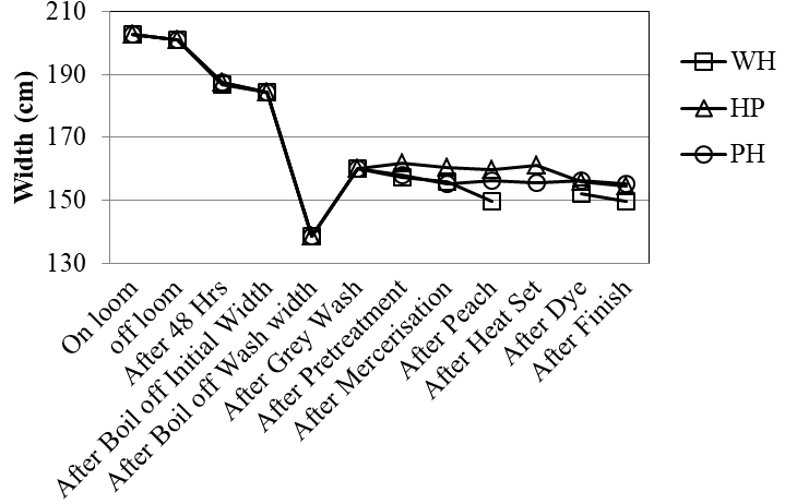 In view of the above facts, this study was conducted with an objective to analyze the role of important processes like heat setting and finishing on the behavioral properties of ‘stretch woven fabric’. The main focus is to achieve the modified or improved cost effective and time saving processes along with the required handle value of fabrics (fabric hand) as per the different end uses. After the processing of the fabrics, the effect on important mechanical properties like EPI (ends per inch), PPI (picks per inch), width, shrinkage, recovery, growth, CRA (crease recovery angle), wrinkle, drape and fabric hand were chosen to analyze the different options to process a ‘stretch fabric’. The processing methods used were without heat set (WH), Heat set then pretreated (HP) and Pretreated then Heat set (PH) thus became important objective of the analysis.