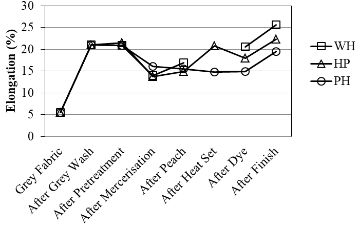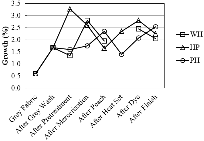 In case of a spandex based stretch fabric, with every post weaving process, fabric undergoes perceptible dimensional changes. These changes become significantly important particularly when finishing process includes heat treatment. The Figure 5 shows an overall increase in elongation due to finishing processes. There is maximum elongation in without heat set sample followed by heat set then pretreated sample and finally pretreated then heat set sample. This was because of heat that fixed the spandex filament in a more relaxed stage. However, a little increase is also represented in elongation values even after heat setting. This behavior can be attributed to successive shrinkage of non-elastic cotton sheath fibers in core spun yarns during subsequent wet processing.3 The Figure 6 shows an overall increase in growth. The without heat set sample shows least growth followed by heat set then pretreated and pretreated then heat set samples. The results indicated that the heat treatment during heat setting limits the elasticity of spandex yarn to some extent results in higher growth in such samples.18