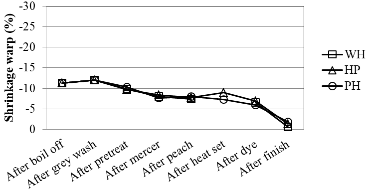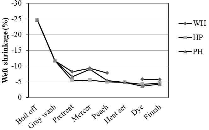 Figure 7 and Figure 8 depicts the shrinkage behavior warp wise and weft wise. There is an overall reduction in shrinkage percentage in due processes of pretreatment, dyeing and final finish. The three object samples show similar trend warp wise but there is an early control of weft shrinkage in case of heat set then pretreated sample than other two. After final finish, the three samples show comparatively same values of shrinkage for warp and weft which means that different processing route has no significant influence on fabric shrinkage.